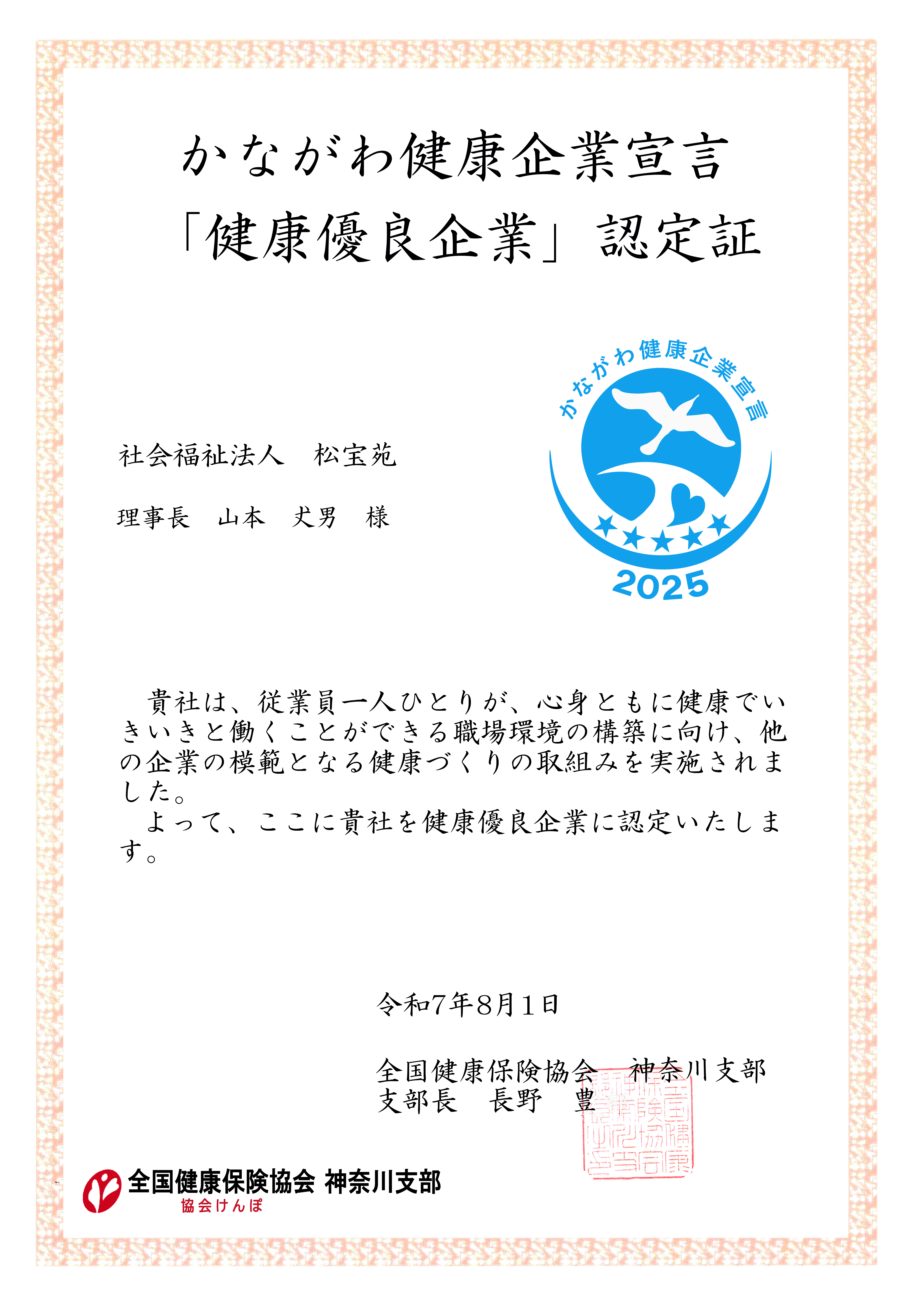 社会福祉法人 松宝苑は、全国健康保険協会神奈川支部より、かながわ健康企業宣言【健康優良企業】2025において、最高ランクの星5つに4年連続認定されました。